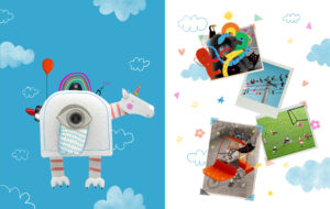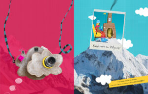 Η Ίρις Σαμαρτζή, η συνδημιουργός του βιβλίου, συνδύασε όπως σχεδόν σε κάθε δουλειά της τη ζωγραφική με το κολλάζ. Εδώ, το προχώρησε κατασκευάζοντας παιχνιδιάρικες κάμερες, λόγου χάριν την αδιάβροχη με τον αναπνευστήρα, αυτή που φωτογραφίζει στο σκοτάδι, εκείνη την ειδική για την πολυχρωμία, για τους δύτες, τους πλανήτες… και τις τοποθέτησε στις σελίδες ανάμεσα στις ζωγραφικές της.