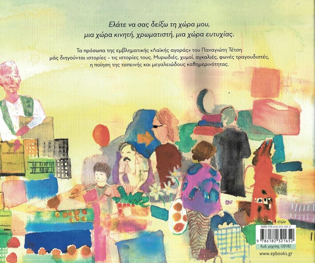 Η συγγραφέας μας ξεναγεί στον κόσμο της λαϊκής αγοράς μέσα από τα λόγια ενός νεαρού αγοριού, του Σπύρου. Δεν είναι ένα υπαρκτό πρόσωπο στον πίνακα του Τέτση, αλλά, όπως μας διευκρινίζει το κείμενο, ένα αγόρι κρυμμένο στην καρότσα ενός φορτηγού πίσω από καφάσια. Ένα αγροτόπαιδο, που όχι μόνο μας καλεί να το ακολουθήσουμε στον κόσμο της λαϊκής αλλά και μας παίρνει μαζί του στα μποστάνια και στις εξοχές της ελληνικής υπαίθρου, που τροφοδοτούν τις λαϊκές αγορές. Που μοιράζεται μαζί μας όχι μόνο τις εμπειρίες που κουβαλάει από την επαφή του με την ελληνική φύση, αλλά κι έναν μυστικό του έρωτα, που δεν είναι άλλος από μια πελάτισσα της λαϊκής, την οποία -σε αντίθεση με τον ίδιο– συναντάμε και στον πίνακα του Τέτση.