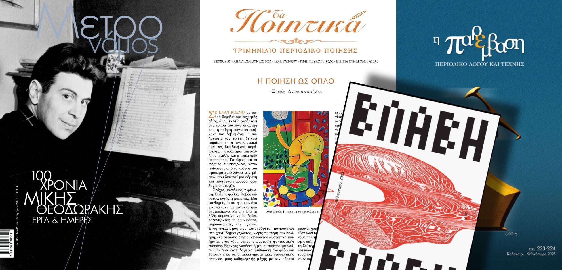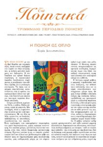 όπλο Ο άνθρωπος «απαξιώνεται κάθε στιγμή, σε όλα τα πλάτη και τα μήκη του πλανήτη» κάνοντας να «πυκνώνουν τα ερωτήματα για το νόημα του κόσμου και της ζωής», διαπιστώνουν στο εκδοτικό σημείωμα του 57ου τεύχους τους Τα Ποιητικά, το τριμηνιαίο περιοδικό ποίησης που εκδίδεται με τη φροντίδα των εκδόσεων Γκοβόστη. Μπροστά σε αυτή τη διαπίστωση οι προβληματισμοί για την έννοια της «στράτευσης» επανέρχονται, κάνοντας το καλό περιοδικό να καταφύγει στην Έλσα Τριολέ («ένα έργο δεν μπορεί να είναι στρατευμένο παρά μόνο όταν η στράτευση είναι το σώμα και το αίμα εκείνου που το δημιουργεί»), ενώ από το εξώφυλλο ήδη, η Σοφία Διονυσοπούλου διαπιστώνει ότι «η ποίηση είναι όπλο – αντιπολεμικό μεν, αλλά όπλο» και πως η τέχνη «δεν δικαιούται να υπνώττει», αλλά «οφείλει να βάλλει ενάντια στον κλοιό της εξουσίας». Σε αυτή την κατεύθυνση κινούνται και οι σελίδες που είναι αφιερωμένες στη μεταφρασμένη ποίηση: Ποιήματα της επαναστάτριας του λόγου και της εικόνας Τζόυς Μανσούρ («Μαύρο αστέρι, πέτρινη Ίσιδα»), βρετανίδας ποιήτριας που ενεπλάκη ενεργά στη δεύτερη περίοδο του υπερρεαλιστικού κινήματος, μεταφρασμένα από τη Σοφία Διονυσοπούλου· στο ίδιο κλίμα, έξι ποιήματα από το Ζωολόγιο ή Συνοδεία του Ορφέα (1911), την πρώτη ποιητική συλλογή του Γκυγιώμ Απολλιναίρ, μεταφρασμένα από τον Γιώργο Γωνιανάκη· τέλος, τέσσερα ποιήματα του αζτέκου βασιλιά-ποιητή Νεζαουαλκόγιοτλ (1402-1472), ενός από τους σημαντικότερους ποιητές, αλλά και σοφούς, της προκολομβιανής Αμερικής, μεταφρασμένα από τα ισπανικά από τη Λούνα Σιμάτου. Ακόμη, στις σελίδες του τεύχους περιλαμβάνεται το δοκίμιο «Μεταξύ φθοράς και αφθαρσίας» του Θεοδόση Πυλαρινού, με αφορμή δυο συλλογές του ποιητή Κωνσταντίνου Νικολάου, ενώ δημοσιεύονται ακόμη κριτικά σημειώματα για πρόσφατες ποιητικές εκδόσεις από τους και τις Βαρβάρα Ρούσσου, Γιάννη Στρούμπα, Μάνια Μεζίτη, Έφη Κατσουρού, Παναγιώτη Βούζη, Νικόλα Τερμεντζή, καθώς και ποιήματα των Ελευθερίας Θάνογλου, Γιάννη Σοφρά, Δημήτρη Λεοντζάκου, Λεωνίδα Ρήγα, ενώ η ύλη του περιοδικού ολοκληρώνεται στο οπισθόφυλλο με ένα ποίημα του Ανδρέα Εμπειρίκου («Ποιος ζει και ποιος πεθαίνει»), με αφορμή τη συμπλήρωση 50 χρόνων από τον θάνατό του.