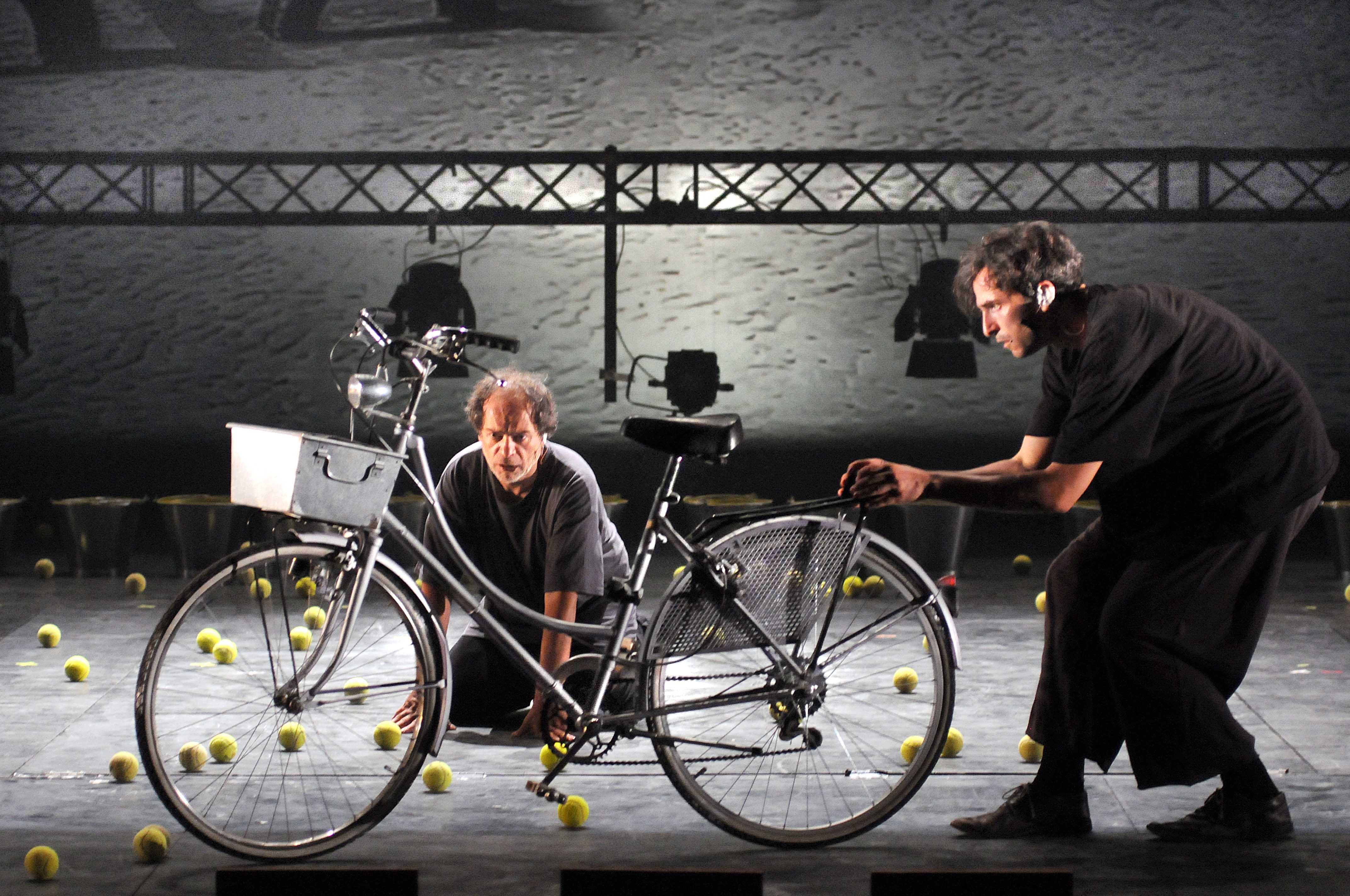 Ξεκίνησα από το σπίτι μου το βράδυ της Παρασκευής 28 Ιουνίου με περίεργη διάθεση. Πού πήγαινα; Πόσο θα άντεχα; Είχε νόημα αυτό που πήγαινα να κάνω; Δηλαδή εγώ πήγαινα να δω μια παράσταση που θα διαρκούσε 24 ώρες; Και μάλιστα Μπέκετ; Εφτασα στην Πειραιώς 260 γύρω στις 11.30 το βράδυ της Παρασκευής 28 Ιουνίου. Είχα μπροστά μου ένα 24ωρο Μπέκετ, την παράσταση που αποφάσισε να κάνει φέτος ο Γιάννης Κακλέας στο Φεστιβάλ Αθηνών. «Μερσιέ και Καμιέ» ο τίτλος της νουβέλας του Σάμουελ Μπέκετ, η ιστορία δύο φίλων, δύο απλών, λαϊκών ανθρώπων που αποφασίζουν να αφήσουν την καθημερινή τους σταθερότητα για ένα ταξίδι. Κάπου, οπουδήποτε. Με ραντεβού, «στον προκαθορισμένο τόπο, την προκαθορισμένη ώρα». Με ελάχιστα εφόδια: ένα ποδήλατο, μια ομπρέλα, έναν σάκο…