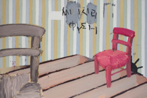 Μια ολόκληρη σειρά πινάκων αποδομούν τα δωμάτια και τα έπιπλά τους, αλλά και τον ίδιο τον λόγο, που διαγράφεται, που μουτζουρώνεται, ενώ ταυτόχρονα οι χρονικότητες συγχέονται: το παρελθόν «εδώ ήταν» συνυπάρχει με το παρόν «εδώ είναι». Η απώλεια αγαπημένων προσώπων (η καρέκλα του Παρασκευά, του αδελφού του Κυριάκου), συναντά την ιστορική μνήμη (την εργαλειοθήκη που παραπέμπει και στον ίδιο, αλλά και στον μηχανοξυλουργό πατέρα και τον μαραγκό αδελφό), μέχρι που φτάνουμε στο απόλυτο σύμβολο της απώλειας, στο «Εδώ ήταν παράθυρο που έβλεπε στη Σαλαμίνα», όπου είναι το ίδιο το δωμάτιο που χάνεται, που καταπίνεται μέσα στο μαύρο.