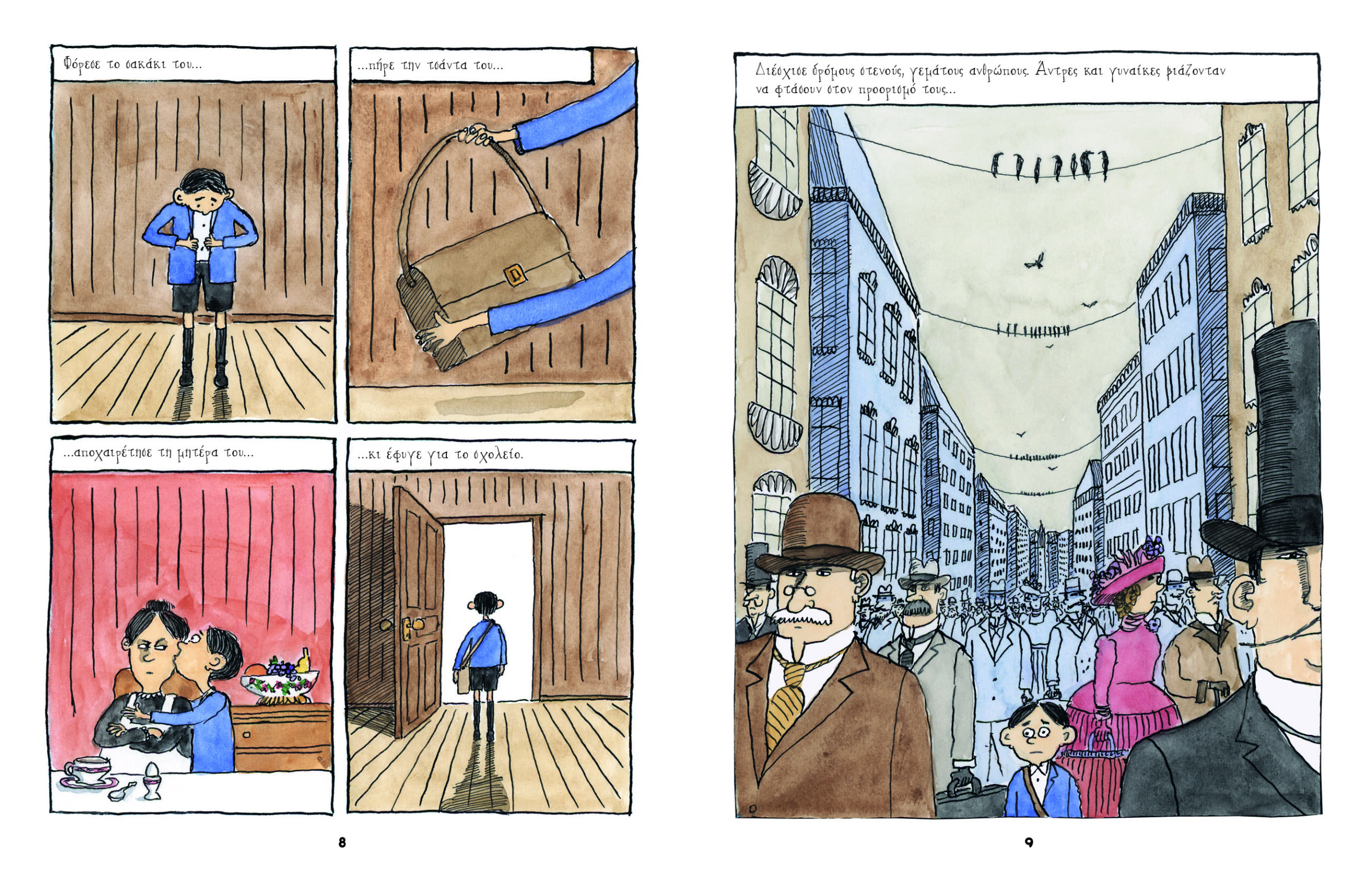 Καθοριστικό ρόλο στη δύναμη του βιβλίου παίζει η εικονογράφηση. Δουλεμένη κυρίως με πενάκι και μελάνι, σε συνδυασμό με την τεχνική γκουάς[1], δημιουργεί έντονες αντιθέσεις φωτός και σκιάς. Οι προοπτικές είναι συχνά «στραβές», τα κτίρια μοιάζουν να γέρνουν απειλητικά και οι ενήλικες απεικονίζονται δυσανάλογα μεγάλοι, ενώ ο μικρός Κ συρρικνώνεται μέσα στον χώρο. Η αισθητική αυτή παραπέμπει στην ευρωπαϊκή εικονογράφηση των αρχών του 20ού αιώνα και στον εξπρεσιονισμό, όπου ο ρεαλισμός υποχωρεί μπροστά στη συναισθηματική αλήθεια της εικόνας. Δεν μας ενδιαφέρει αν κάτι είναι «σωστό» οπτικά — μας ενδιαφέρει πώς νιώθει ο ήρωας μέσα σε αυτόν τον κόσμο. Η εμπειρία ανάγνωσης είναι, λοιπόν, διπλή: οπτική και λογοτεχνική. Το νόημα δεν βρίσκεται μόνο στις λέξεις ούτε μόνο στις εικόνες, αλλά στη μεταξύ τους σχέση. Αυτός ο τρόπος αφήγησης αντικατοπτρίζει ακριβώς την εξέλιξη του graphic novel ως είδους στον 21ο αιώνα.