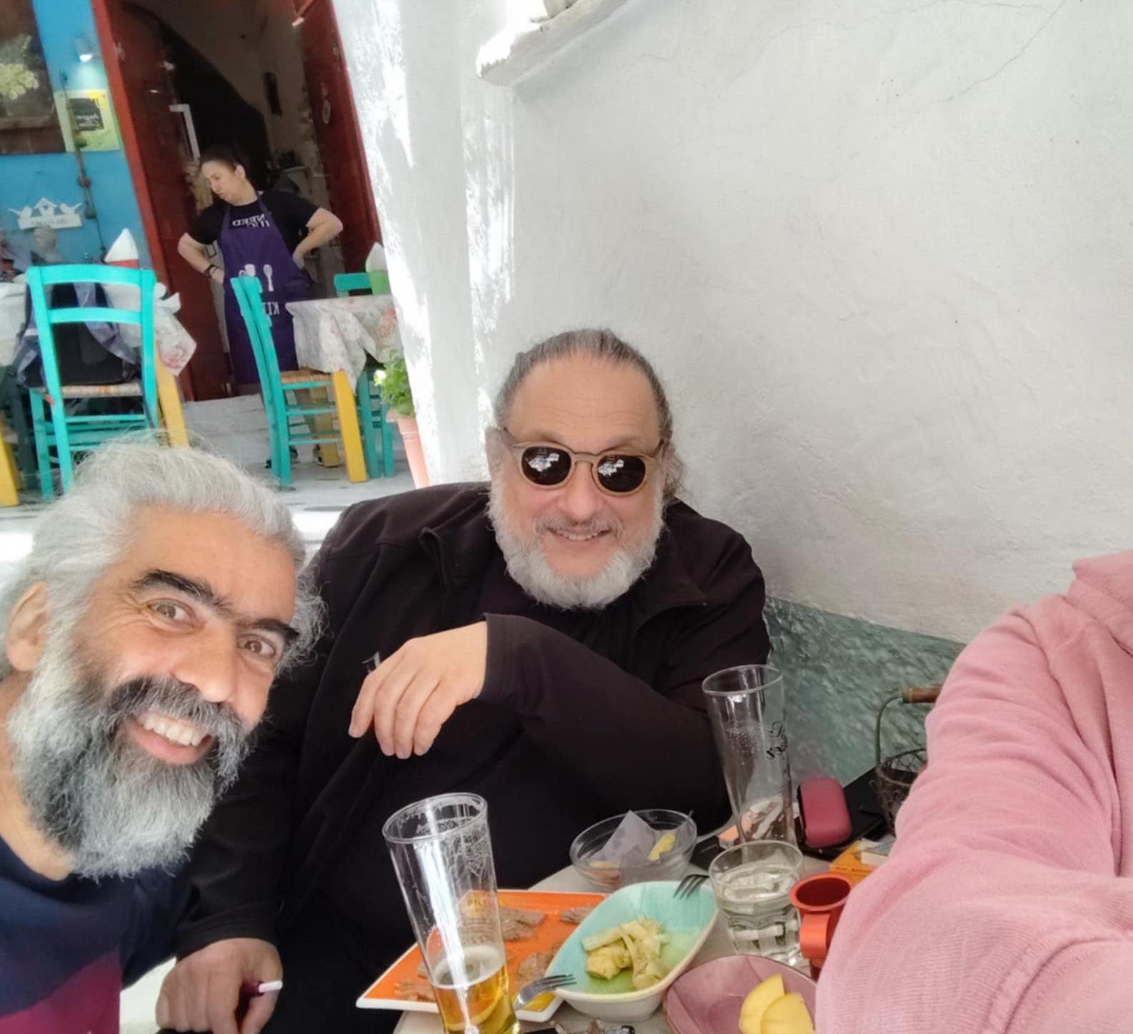 Κοιτώ την φωτογραφία από την τελευταία επίσκεψη του στο νησί, αυθημερόν για δουλειά. Πιώμα, κουβέντες και μπόλικο γέλιο στο αγαπημένο στέκι του Κυριάκου. Ίσα που πρόλαβε το καράβι της επιστροφής.