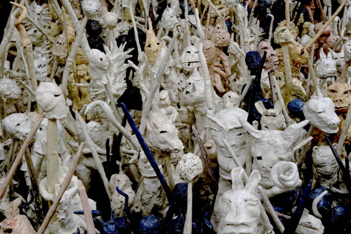Το υπεροπτικό αποικιοκρατικό βλέμμα απέναντι στα ζώα, όπως και απέναντι στους αυτόχθονες πληθυσμούς, δεν λείπει βέβαια από την έκθεση (όπως η εντυπωσιακή στάση λεωφορείου από κεραμικά κόκκαλα της Elisabetta Benassi, Mfumu, το όνομα της οποίας παραπέμπει στον κογκολέζο διανοούμενο ακτιβιστή των αρχών του 20ού αι., ή η εννοιολογική αποδόμηση ενός ρινόκερου-εκθέματος του 18ου αι., της Clara, από την Rossela Biscotti), εμφανίζεται όμως κυρίως ως ένα ιστορικό ζήτημα, που η σημερινή του απόληξη είναι ίσως το κυνήγι (όπως στις φωτογραφίες του Mark Gion, Men and game, ή στα εραλδικά του λάβαρα ή με εντυπωσιακά έξυπνο τρόπο, με κλαδιά αντί για κέρατα, στα Taxonomic trophies του Maarten Vanden Eynde) και όχι ως ένα απολύτως παροντικό πρόβλημα. Ευτυχώς που υπάρχει το άμεσα πολιτικό έργο του Sammy Baloji, Hunting and collecting, όπου, εκτός από τις αναφορές στην αποικιοκρατία, συμπεριέχονται και τα 376 ονόματα των σύγχρονων ΜΚΟ που δραστηριοποιούνται αυτή τη στιγμή σε δύο μόνο από τις 26 περιφέρειες της Λαϊκής Δημοκρατίας του Κονγκό… Οπωσδήποτε κανείς δεν πρέπει να παραλείψει να δει και την ατομική έκθεση του Baloji στο ΕΜΣΤ, που και αναδεικνύει τη σημερινή αποικιοκρατική εκμετάλλευση των πρώτων υλών (Shinkolobwes abstraction, Untitled) και προσπαθεί να στηρίξει το έργο του στα παραδοσιακά υφάσματα (The crossing, Of the moon and velvet κ.ά.) και κυρίως γιατί, παρά το ότι παρουσιάζεται επιμελητικά με ένα μάλλον ψυχρό τρόπο, περιέχει συγκλονιστικά έργα, όπως το Essay on urban planning, που παραλληλίζει τον πολεοδομικό φυλετικό διαχωρισμό του Λουμούμπασι και τις γειτονιές των μαύρων με την ταξινόμηση των μυγών ή η σειρά Triga Mark που συνδυάζει την προώθηση πολιτιστικών προϊόντων από τη CIA, όπως η τζαζ και το αμερικανικό informel, με τις αμερικανικές επεμβάσεις για την εξόντωση του Λουμούμπα (γιατί υπάρχουν, πράγματι, μνήμες αγωνιστών που δεν στοιχειώνουν μόνο την Αφρική, αλλά και ολόκληρο τον κόσμο).