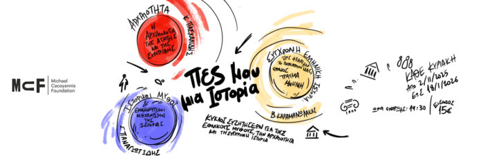 Συνεχίζεται με επιτυχία ο δημιουργικός διάλογος με το ιστορικό παρελθόν, τον οποίο επιχειρεί να πυροδοτήσει το Ίδρυμα Μιχάλης Κακογιάννης, προσκαλώντας τρεις διακεκριμένους ιστορικούς και συγγραφείς να παρουσιάσουν τρεις κύκλους συζητήσεων, με τίτλο «Πες μου μια Ιστορία», που διατρέχουν την αρχαιότητα και τη σύγχρονη ελληνική ιστορία, αναδεικνύοντας μύθους οι οποίοι έχουν καθορίσει την ελληνική ταυτότητα.