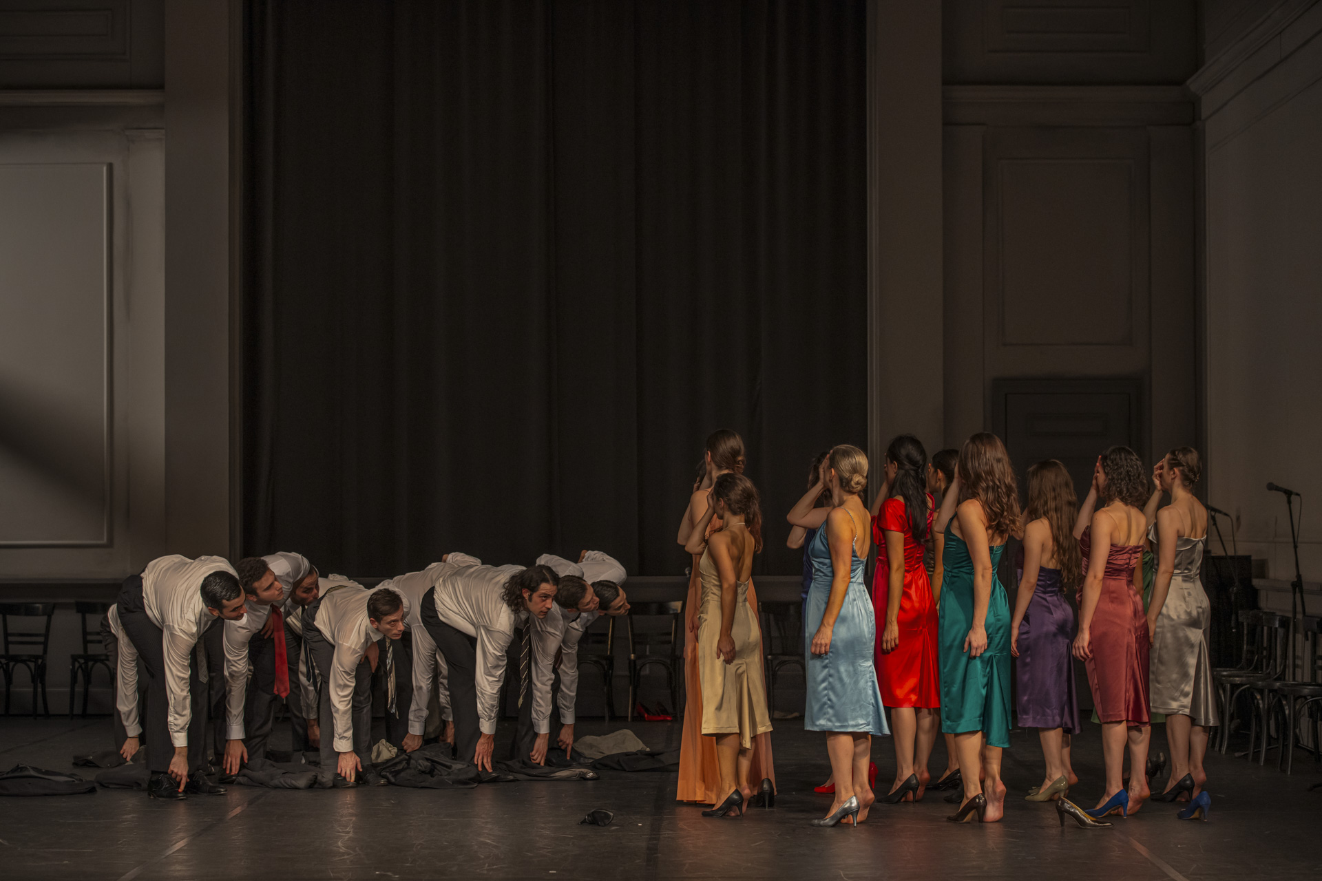 Δεν χρειάστηκε πολύς χρόνος για να αρθούν οι όποιοι ενδοιασμοί μου. Γιατί στην τεράστια Κεντρική Σκηνή οι 23 Έλληνες ερμηνευτές και ερμηνεύτριες, που επιλέχθηκαν ειδικά γι’ αυτή την αναβίωση, «μίλησαν» μέσα από τα βήματα του χορού τους. Και είπαν πολλά. Μέσα από τα βήματα του τάνγκο, του swing, του φοξ αγγλέ, του βαλς, του τσάρλεστον, του rock and roll μετέφεραν την ιστορία της αναζήτησης και της συνάντησης των σωμάτων, την ιστορία του μοιράσματος των αισθημάτων ανάμεσα σε άνδρες και γυναίκες, ανάμεσα σε παρέες, σε κοινότητες, την ιστορία του φλερτ, του ερωτισμού, του πάθους. Κι όλα αυτά μέσα από χορούς, βήματα, αγγίγματα, που «έλεγαν» πολλά: για σαγήνη, πάθος, απόρριψη, φόβους, επιθυμίες, εκκλήσεις συντροφιάς, διαφωνίες, αρνήσεις, επιδεικτικά αγγίγματα. Για σεξουαλικές φαντασιώσεις, για αιδημοσύνη μπροστά στο γυμνό σώμα, για τη χαρά, τον πόνο, την απογοήτευση, τη βία, την επιβολή, τη γυναίκα-αντικείμενο. Για το πένθος, την οδύνη, την απώλεια, την αναζήτηση στηρίγματος, την ερημιά, την παρηγοριά. Για το θόρυβο, την προσπάθεια επικοινωνίας, την ένταση, την απόσταση, την απομάκρυνση, τη σιωπή… Ήταν «μια γλώσσα για τη ζωή». Ήταν σπονδυλωτές ιστορίες, για την ιστορία της επαφής, της συνάντησης, του έρωτα.