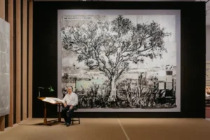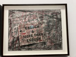 Απολαμβάνοντας τα σχέδια από μαύρο και κόκκινο μελάνι και από κάρβουνο, σταματάω μπροστά σε έναν πελώριο πίνακα που από μόνος του καταλαμβάνει έναν ολόκληρο τοίχο. Πρόκειται για το κολλάζ ενός δέντρου που δεσπόζει σε ένα τοπίο χαμηλής πυκνής βλάστησης και ανοιχτού πεδίου. Πλησιάζω και διαπιστώνω ότι ο κορμός του και η φυλλωσιά είναι γεμάτη από λέξεις μηνύματα. Διαβάζοντας τα, σιγά σιγά ταξιδεύουν το λογισμό μου μακριά από αυτό το Νοτιοαφρικάνικο τοπίο, και τον φέρνουν στην άλλη άκρη της ηπείρου, εκεί παραδίπλα, στη Λωρίδα της Γάζας, όπου συμβαίνουν πράγματα φριχτά. Και αυτά τα λόγια του Κέντριτζ που πηγάζουν από προσωπικά, πολιτικά, ιστορικά βιώματα του στη δική του πατρίδα τα χρόνια τα δύσκολα εκεί, την εποχή του απαρτχάϊντ, δίνουν φωνή σε αισθήματα για αυτά που βιώνουμε τις μέρες μας, έστω και μέσα από την οθόνη, σε εκείνη την πονεμένη Παλαιστινιακή γη.
