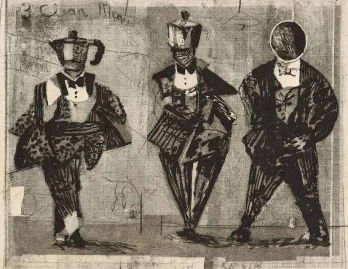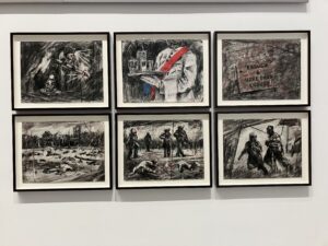 Στη συνέχεια του περιπάτου μου στη γκαλερί, μετά τα πελώρια κουρνιασμένα πουλιά, μετά το γυμνό, ώριμης ηλικίας, σώμα του καλλιτέχνη, μετά από κάποια παιχνίδια με τη σκέψη, και με το είδωλο της μορφής μπροστά σε έναν καθρέφτη, στάθηκα προσεκτικά σε μια ομάδα από έξη μικρότερα σχέδια από κάρβουνο και μελάνι. Το θέμα τους, προφανώς, ήταν η βαναυσότητα του καθεστώτος του απαρτχάϊντ, και η βία στα ορυχεία της Νότιας Αφρικής. Εργάτες μέσα σε τούνελ, στρατιώτες με τα όπλα στραμμένα σε άοπλους μαύρους πολίτες, μια περιοχή γεμάτη πτώματα στο χώμα, και ο κορμός του επίσημα ντυμένου σερβιτόρου με έναν δίσκο ποτά που προορίζονται, προφανώς, για τους «άρχοντες». Αυτά, εικονίζονται στα πέντε από τα σχέδια. Το έκτο περιέχει μόνο λόγια, γραμμένα κάποια σαν ποίημα, κάποια με τα τεράστια γράμματα ενός πανό διαμαρτυρίας: