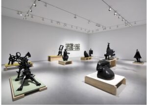 Ο Γουίλιαμ Κέντριτζ είναι Νοτιοαφρικανός, εβραϊκής καταγωγής, στα 70 του, και εκθέτει τη δουλειά του στη Νέα Υόρκη επί δεκαετίες τώρα. Ένα έργο διαρκείας που συνδυάζει το προσωπικό με το πολιτικό με υποδειγματική πειθαρχία και επιτυχία. Και παρόλο που η τεχνική του έχει μια σταθερότητα, δεν παύει να μας εκπλήσσει και να μας μαγνητίζει κάθε φορά. Η παρούσα έκθεση, που έχει τον τίτλο «Μια Φυσική Ιστορία του Ατελιέ» («A Natural History of the Studio») αποτελείται από ένα φιλμ, με εννέα επεισόδια (σε έναν ειδικά διαρρυθμισμένο χώρο του ισόγειου της γκαλερί), και από τα έργα (σχέδια, κολλάζ, και γλυπτά) που βλέπουμε τον καλλιτέχνη να τα δημιουργεί (μόνος ή και με συνεργάτες του) σε αυτό το φιλμ. Το μέρος του ισόγειου όπου προβάλλεται το φιλμ έχει διαρρυθμιστεί να μοιάζει με το ατελιέ του Κέντριτζ και να περιλαμβάνει πολλά από τα αντικείμενα τού πραγματικού στούντιο που εικονίζεται στο φιλμ. Στον υπόλοιπο, κατά πολύ μεγαλύτερο χώρο, εκτίθενται τα σχέδια (από μικρά μέχρι τεράστια που πιάνουν έναν ολόκληρο τοίχο). Και στο δεύτερο όροφο εκτίθενται τα γλυπτά, που για εμένα είναι μια έκφανση της τέχνης του Κέντριτζ που βλέπω για πρώτη φορά. Μια ομάδα από αυτά φαίνονται σαν πανύψηλες ανθρώπινες, αεράτες, μορφές αφηρημένης έκφρασης, κατασκευασμένες από μη συμμετρικά κομμάτια αλουμίνιου χρωματισμένα κόκκινο, κίτρινο, και πορτοκαλί. Μια άλλη ομάδα γλυπτών αποτελείται από βαριά, στέρεα, μπρούτζινα κομμάτια με μια στρώση μαύρης μπογιάς. Πρόκειται για αναγνωρίσιμες μορφές μεν (μια συσκευή παλιού τηλέφωνου, ένα ιδιόμορφο περιστέρι, και ιδιόμορφες ανθρώπινες μορφές) αλλά σε εκφάνσεις σουρεαλιστικής έκφρασης και παιχνιδιού.
