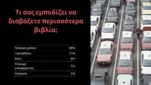Το σημαντικότερο εμπόδιο για την ανάγνωση είναι η έλλειψη χρόνου, η οποία αναφέρεται από περίπου τα δύο τρίτα των συμμετεχόντων και στα δύο φύλα. Η τιμή των βιβλίων αναφέρεται από σαφώς μικρότερο ποσοστό, ενώ η έλλειψη ενδιαφέροντος για το διάβασμα καταγράφεται σε ακόμη χαμηλότερες τιμές. Τα ευρήματα είναι συμβατά με έρευνες που δείχνουν ότι ο «χρόνος» αποτελεί τον πιο συχνό λόγο μη ανάγνωσης, περισσότερο από το κόστος ή την πρόσβαση, ιδιαίτερα σε κοινωνίες με υψηλά επίπεδα εργασιακής έντασης και ψηφιακής χρήσης (NEA, 2007). Στις μεταβιομηχανικές κοινωνίες, ο κατακερματισμός της προσοχής και ο ανταγωνισμός από τα ψηφιακά μέσα μειώνουν τον διαθέσιμο χρόνο για ανάγνωση βιβλίων, ακόμη και όταν η ανάγνωση αντιμετωπίζεται θετικά.